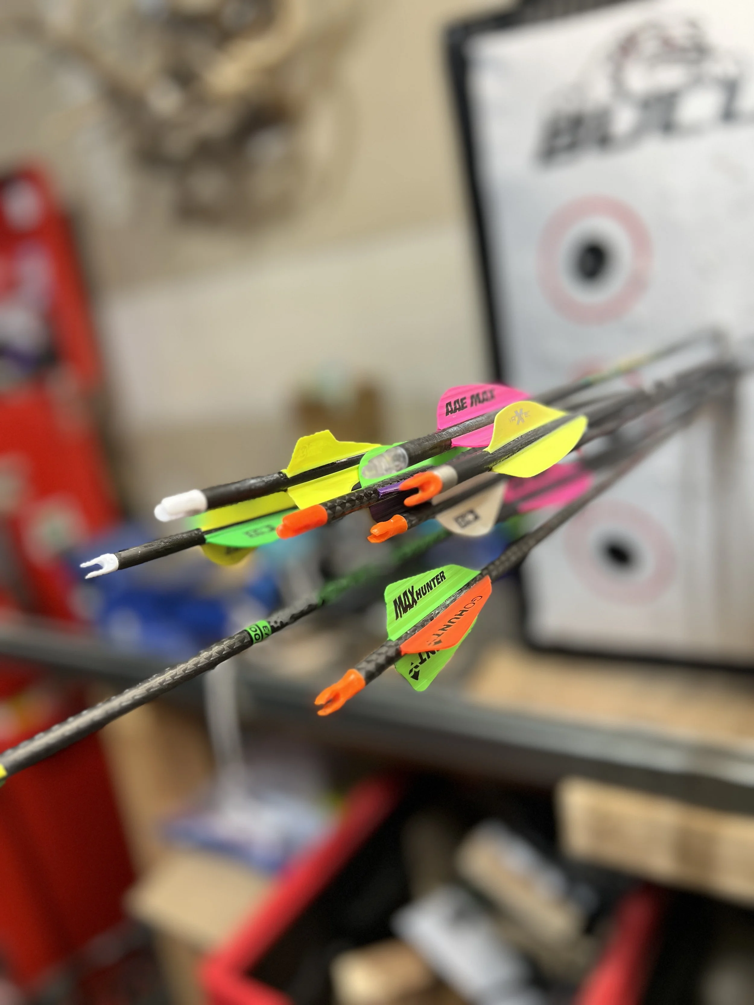 Custom arrows are simply a more refined product. I will take the time to spin every arrow, cut and square all the ends, mark the spine (the stiffest part of the arrow), glue all the components, and fletch each arrow the way you want. I take pride in my work, and I will ensure that you are getting a good product.